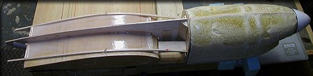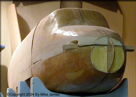 The cowling plug is nearly ready for a little filler, and the final glassing. The surface here is a very tough epoxy-microballons mixture. |