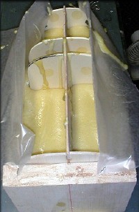 First, I poured in just enough foam to stabilize the structure and form a "floor". This keeps excessive heat or pressure from the foam expansion from distorting any of the formers. After giving this a few minutes to set up, I poured enough extra foam into the form to intentionally overflow. It's very easy to carve away the excess foam once it's cured. For now, total coverage of all the formers is the goal. Neatness is not important at this stage. |
