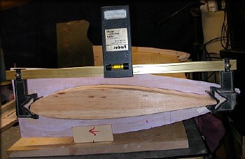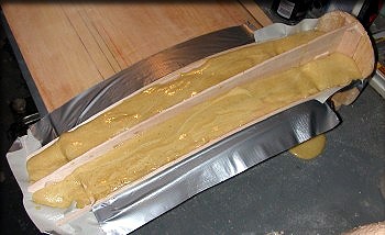 You can see that the keel and formers are "poking out" of the surface. That's intentional, since the formers were cut with an allowance for 1/8" of surface buildup. After the second fill coat and fiberglassing, the surface will expand beyond the formers. |