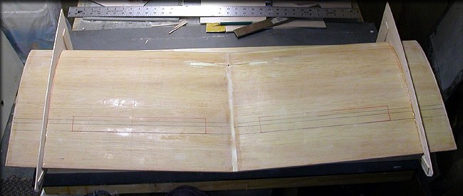 After mounting the nacelle keels, I drew the nacelle outline directly on the wing. Sticks were then pinned to the wing, so that their inside edges are right up against the scale outline. Then, a layer of epoxy and micro-balloons was added between the sticks.The sticks are only pinned down, not glued, and will be removed, once the epoxy has cured. ...So, why did I do this? I'll be using relatively soft materials such as balsa and foam to initially build up the surface of the nacelles on the wing. The layer of epoxy and microballoons provides a precise, tough edge, along with a different color, which will insure that I build the nacelles within the scale outlines. |
