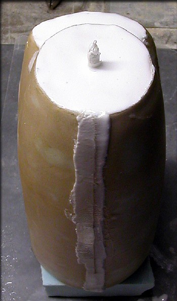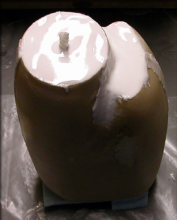 After the foam was poured into the cowling form, (See below) and allowed to overflow, this is what you have. Although this looks horrible, remember... it's only foam, and very easy to carve and sand. I always let these things sit overnight, to be sure it's fully cured. You'll hear it "crackle" occasionally. When it stops crackling for at least a couple of hours, it's done. |