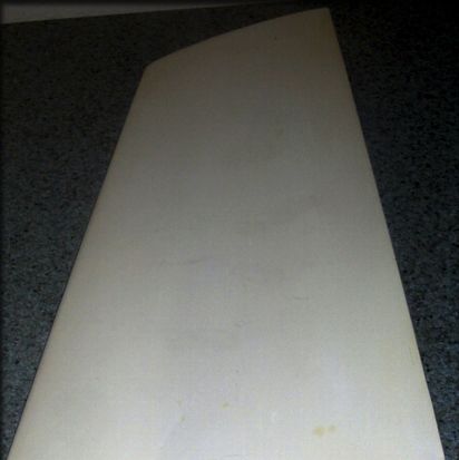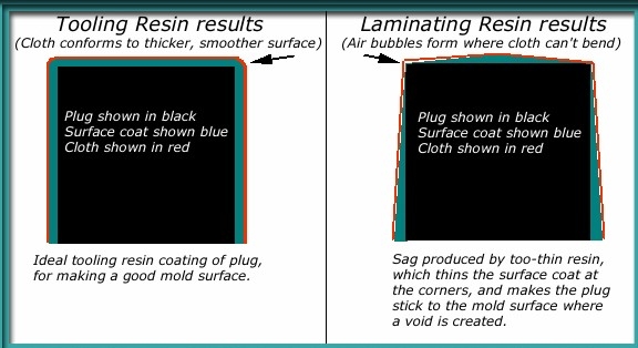 Before you begin the layup, you must carefully wax the entire exposed half of the plug, including the surface of the parting board, and then spray it with a coat of mold release agent, such as PVA. (Poly Vinyl Alcohol) While this is drying, precut all your pieces of cloth, and get all your tools ready. You'll need epoxy, mixing cups, gloves, stir sticks, and other tools of your own choice, such as resin rollers or brushes, to apply the epoxy. You must use a high quality "laminating resin". Attempting to do this with cheap resin is a waste of time, so don't do it. You need very slow curing (12 to 24-hour) resin, to give you a lot of working time. The image below bears out my experience with surface coats. There's nothing like a nice professional tooling resin. The tooling resin coat, applied without any cloth, is very thick, in order to give a uniform thickness, whereas all the following layers (with cloth and/or matt) use an extremely thin laminating resin.