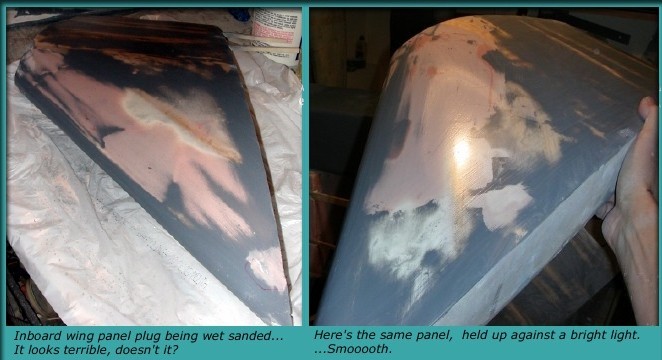 Try not to vary the TEXTURE of your surface too much. On a flying model, you might use a lightweight "spackle" type filler, but on a plug intended to produce molds, you'll want to generally use the tougher ones... Harder to sand, but more durable. Try and NOT vary the chemicals too much, since they make for both an uneven visual presentation (above) and uneven sanding, due to different relative hardnesses.