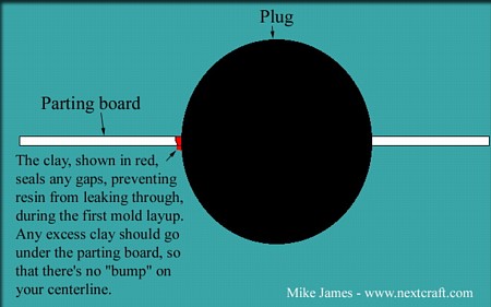 Plan ahead. You'll be applying a layer of gel coat, or resin (often colored black, to make the white cloth show in the mold, later) followed by at least one layer of fairly light cloth, such as 2 oz. or 4 oz. cloth. Each layer must extend onto the parting board at least an inch or two, to form a mold flange. Be sure that the cloth can conform to the shape of your plug. After that, you'll apply many layers of heavier cloth, such as 6 oz. fiberglass, to build up a stiff mold half. I like for mine to be at least 1/2 inch to 3/4 inch thick, so that it'll remain rigid and straight. After the 6 oz. cloth, you can use heavier fiberglass "mat", if you like, just to build up thickness and strength. Remember though, that "mat" has a prickly surface when cured that is rather like handling a cactus. Although more expensive, you might be better off sticking to cloth!