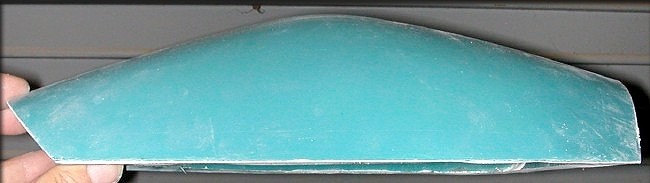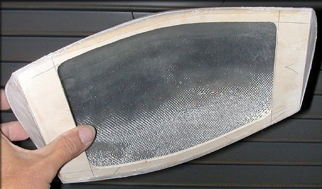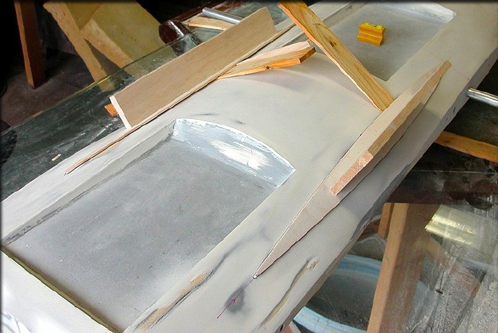 The parting board setup you see here above will allow us to simply lay cloth into the "bowl" part of the canopy, then lay cloth onto the "floor" part of the mold, and join them normally, like any other mold. A simple bead of filled epoxy will complete the joining, with no "tape" required.