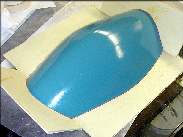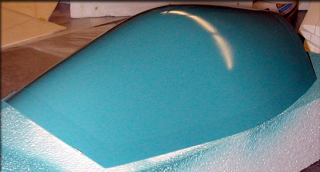 Tail surfaces and canopy plug were given a coat of engine enamel, as the final pre-mold finish.