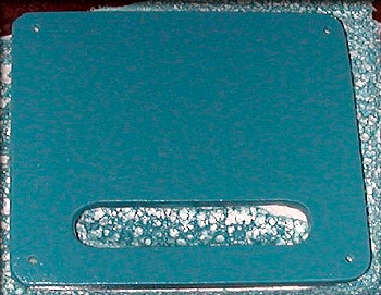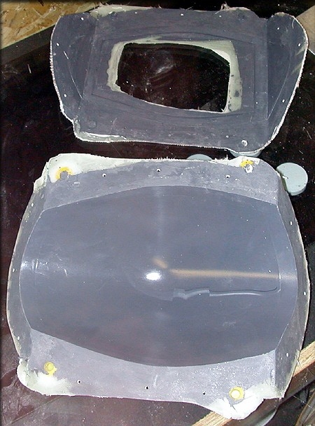 The seam was adequately hidden, so in that regard, this test was a success. The seam was technically right "at" the edge, so some careful sanding of the flashing produced a medium-grade part. This test piece was molded especially lightly, to see what was required, using only 2 layers of 2 oz. cloth, along with a bit of Cabosil to form a fillet around the inside of the seam. It weighs 2 ounces, painted. That's very light. But, it was easily twisted, and when deformed, would either crease, or break the seam at the floor. I decided that this wasn't good enough, and tried a different approach, below. The surface area for this part, excluding the frame, is about 100 square inches.