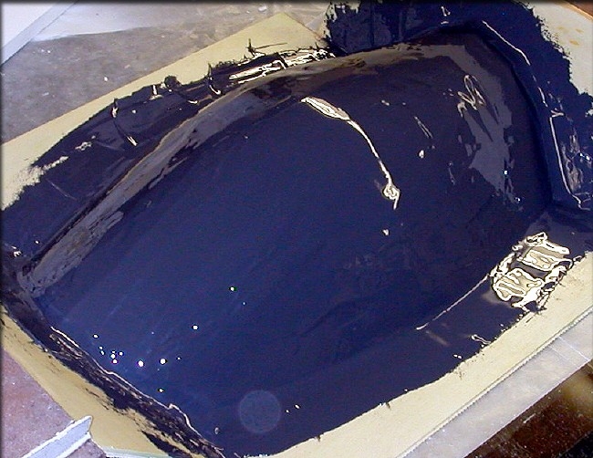 After waxing the canopy plug and parting board, and giving them a coat of PVA, a layer of tooling resin, pigmented black, was added. This was allowed to firm up for about one hour before the next step. Waiting insures that the part won't move around.
