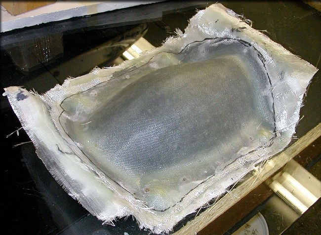 Another canopy was made in the "bowl" or top part of the canopy mold. This time, I didn't bother with the paint, since I know it works. This piece was made with two layers of 2 oz cloth, followed by 1 layer of 6 oz. cloth. And, instead of a molded bottom, I simply made a frame from 1/8" lite ply.