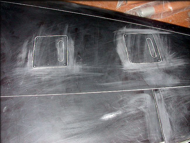 The servo hatches are also etched into the wing bottoms. Later, I'll make shallow female molds of these, as I did with the gear doors. The builder can then cut out the servo hatches, without worrying too much if they damage them, since I'll supply separate ones.