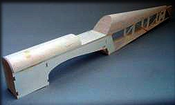 Can you tell yet that I like this kit? This kit retails for $229.95, and it's my opinion that this a very good deal. I think the best thing I could say about the kit is that it's built like a serious competitor would do it, with an emphasis on good design. It's VERY light, only being "beefed up" at the firewall, landing gear mount, and wing center section, which is how it should be done. Many of the "stock" kits you find at the local hobby shop are seriously overbuilt, resulting in extra weight. This kit spans 59 inches, with 970 square inches of area. At a projected weight of 5.5 to 6 lbs., with a .60-size 2-cycle. this gives a wing loading around 14 oz./sq. ft. Anthony tells me that this model will float down and land at 7 mph! It has a thick symmetrical airfoil, perfect for 3D, with huge ailerons, rudder, and split elevator halves.