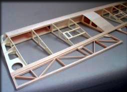 The wing is extremely light, built from truss-style, rather than sheet ribs, and is also very nicely covered, with the servo mounting rails already installed. I later learned several impressive things about the quality of the factory building process. All the balsa is contest grade and very light. The model is factory-assembled in a jig, (by workers who fly airplanes!) using wood glue instead of CA, and is completely dried in the jig before removal. This gives you a very strong, light, and neat-looking structure. I inspected all the glue joints that I could, and found no weak points. The fuselage is designed to have the rudder and elevator servos mounted in the tail, and those mounts are installed too. Blind nuts for the wing bolts were already installed in a secure plywood plate, and integrated with the fuselage sides. As an added bonus, there are some nice crisp red and white "FasCal" markings included on several separate sheets.
